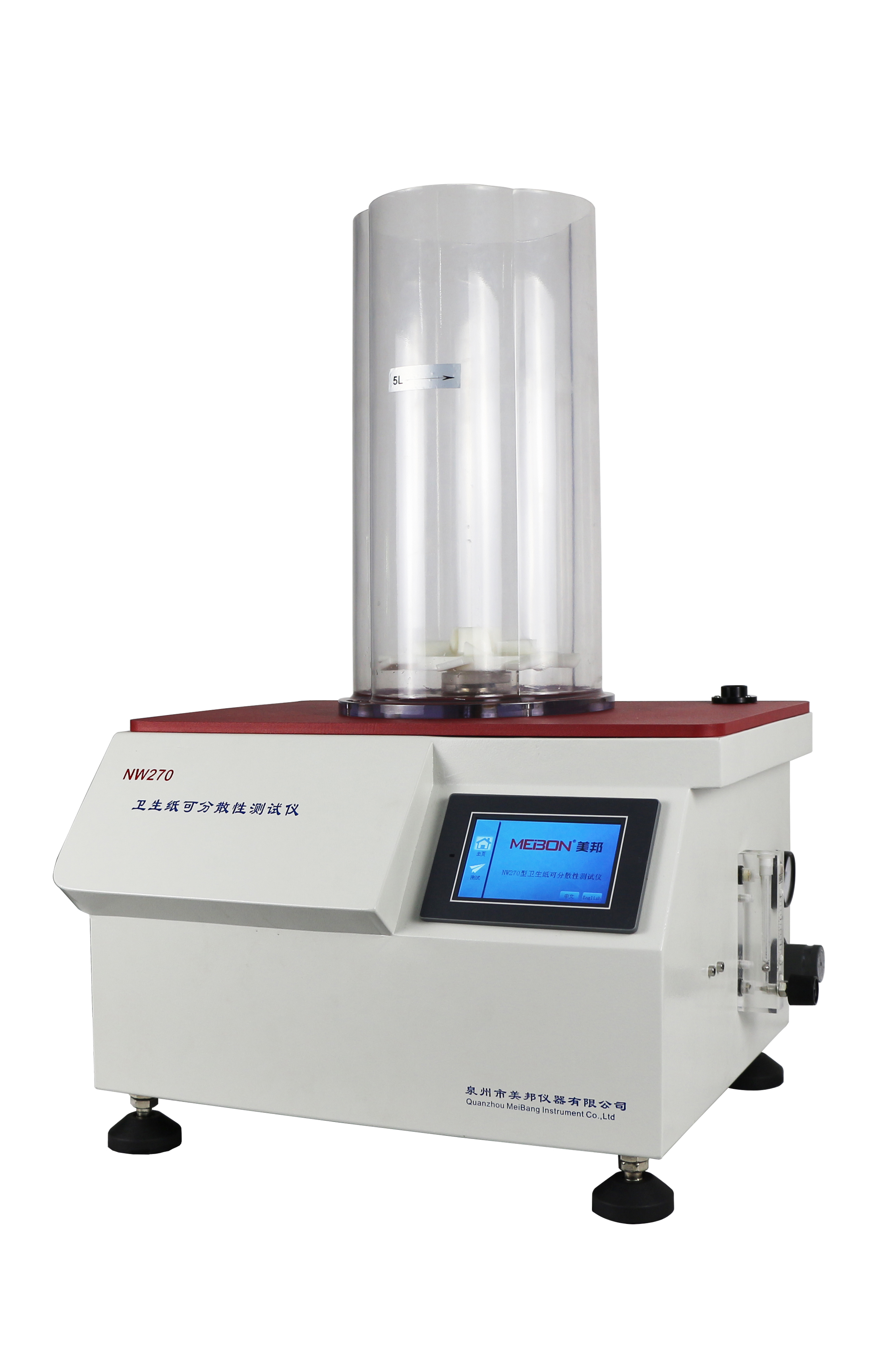 NW270型衛(wèi)生紙可分散性試驗(yàn)儀主要用于廚房紙、紙巾紙、手帕紙、餐巾紙等衛(wèi)生紙及其制品的可分散性測(cè)試,是根據(jù)新國(guó)標(biāo)GB/T 20810規(guī)定的測(cè)試方法研制而成,測(cè)試時(shí)在儀器的桶內(nèi)加入水,向其中注入空氣,啟動(dòng)轉(zhuǎn)子形成漩渦后,將衛(wèi)生紙放入旋渦中,如果衛(wèi)生紙只能在40秒內(nèi)分散,即為合格。